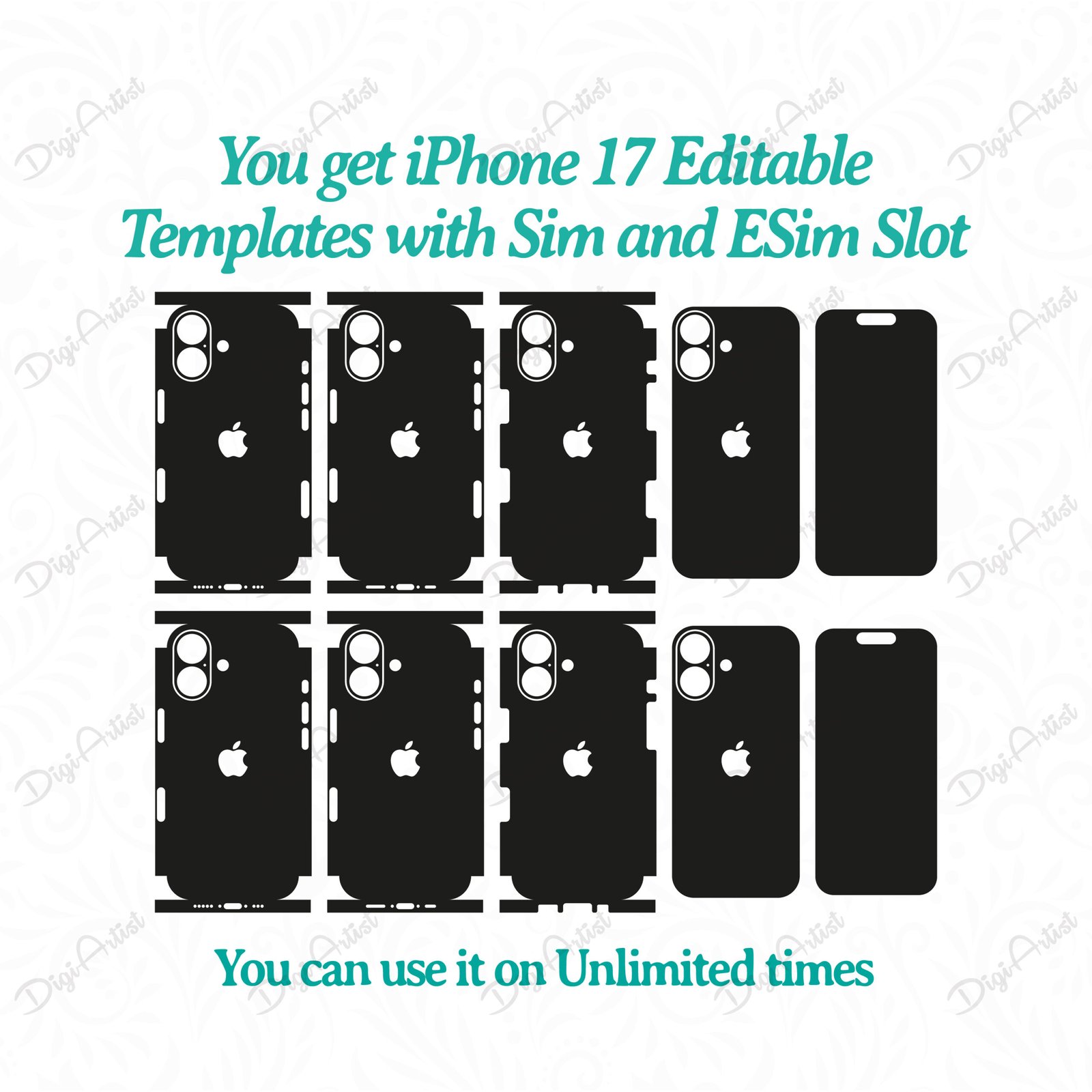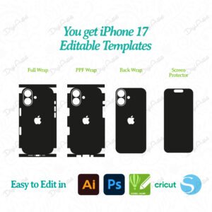 iPhone 17 Skin Editable Template by DigiArtist Store is easy to cut and use, allowing users to select the design that best suits their style. iPhone 17 Skin Cut Files for Cricut Printable Templates are available in AI, EPS, SVG, PDF, and PNG files. Use any software for editing, with Adobe Illustrator being the recommended choice for optimal customization.