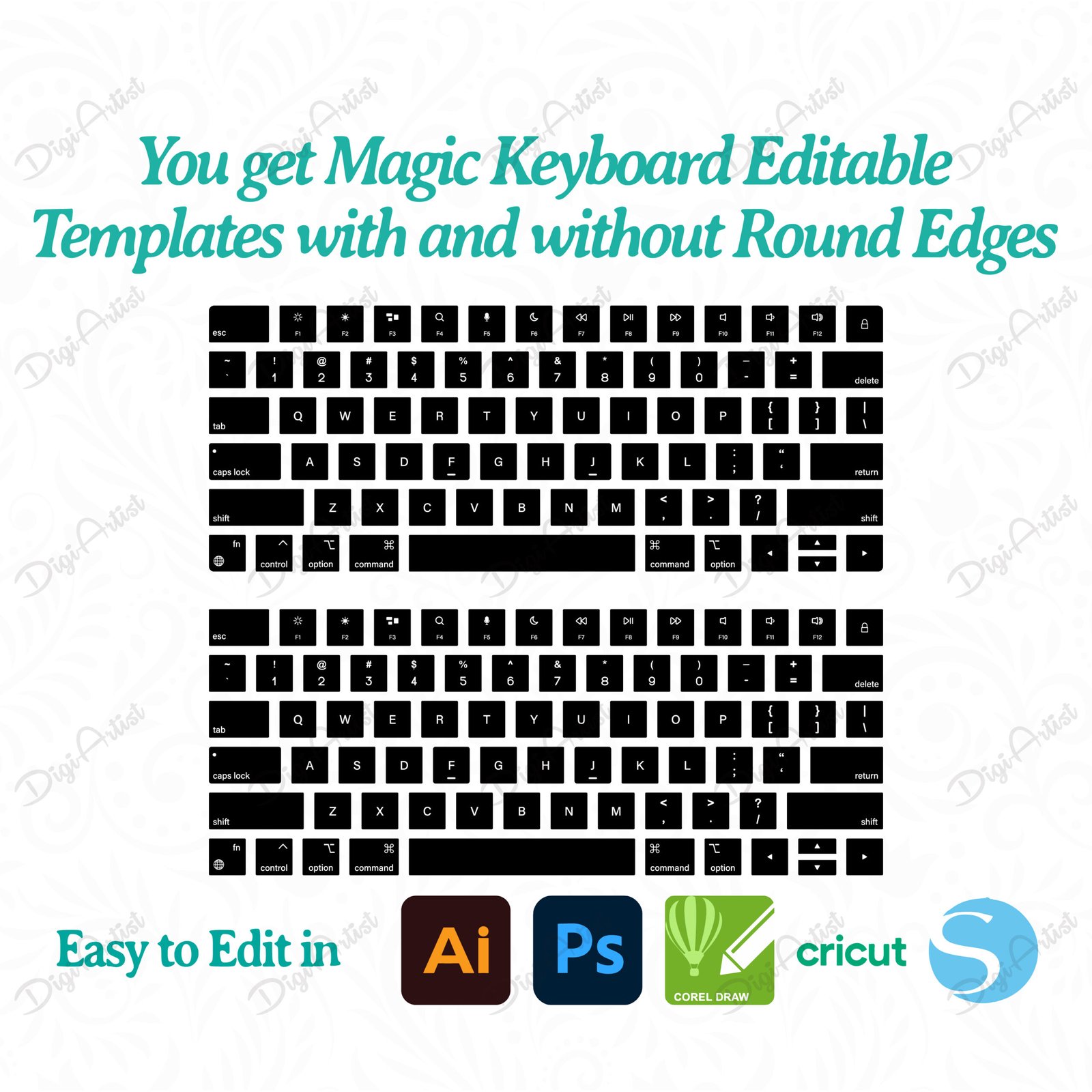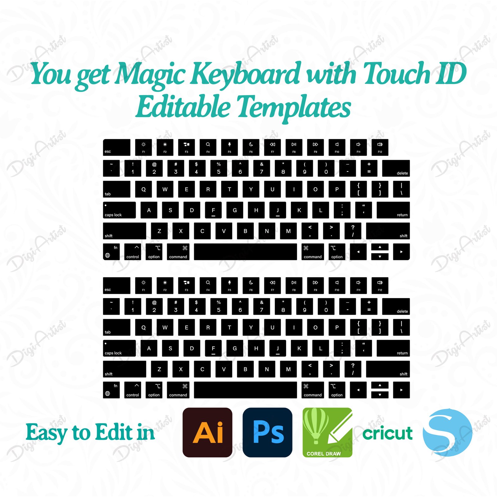 Magic Keyboard with Touch ID Skin Editable Template by DigiArtist Store is easy to cut and use, allowing users to select the design that best suits their style. Magic Keyboard Skin Cut Files for Cricut Printable Templates are available in AI, EPS, SVG, PDF, and PNG files. Use any software for editing, with Adobe Illustrator being the recommended choice for optimal customization.