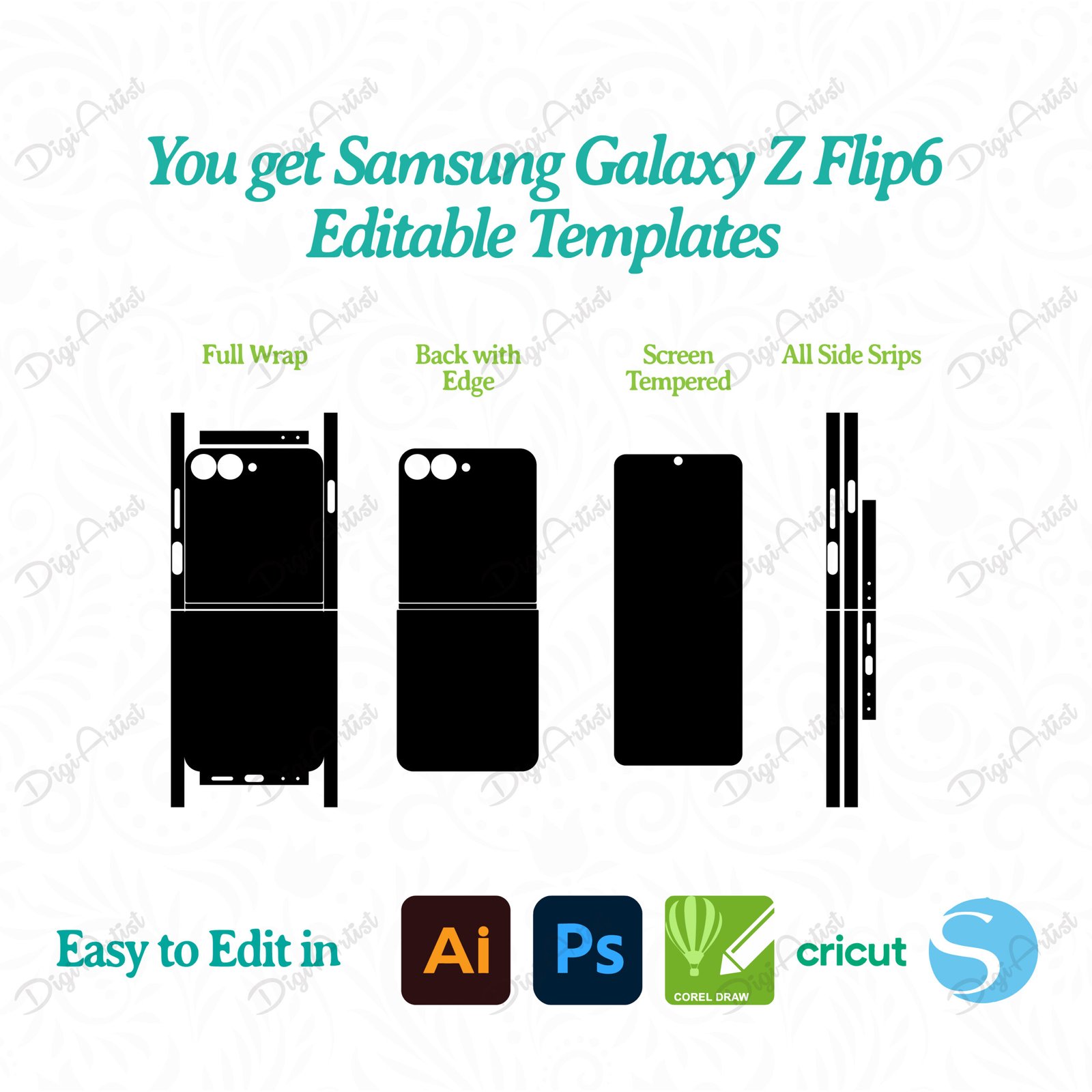 Samsung Galaxy Z Flip 6 Skin Editable Template by DigiArtist Store is easy to cut and use, allowing users to select the design that best suits their style. Samsung Z Flip 6 Skin Cut Files for Cricut Printable Templates are available in AI, EPS, SVG, PDF, and PNG files. Use any software for editing, with Adobe Illustrator being the recommended choice for optimal customization.